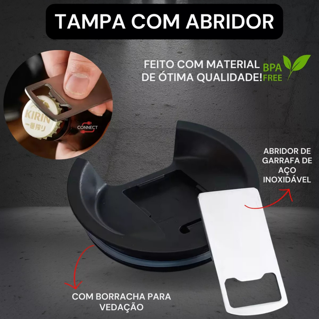 Pensando em todas as ocasiões, o copo possui uma tampa segura vazada com o encaixe perfeito para boca. Sua dupla parede térmica é perfeita para manter a temperatura gelada ou quente por horas. Seu tamanho compacto e funcional cabe em bolsas ou lugares pequenos e pode ser transportado para vários lugares sem correr o risco de quebrar e causar ferimentos ao cair. Pensado em tudo, ainda acompanha um abridor de garrafa a sua disposição!
